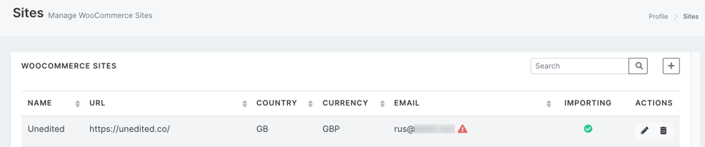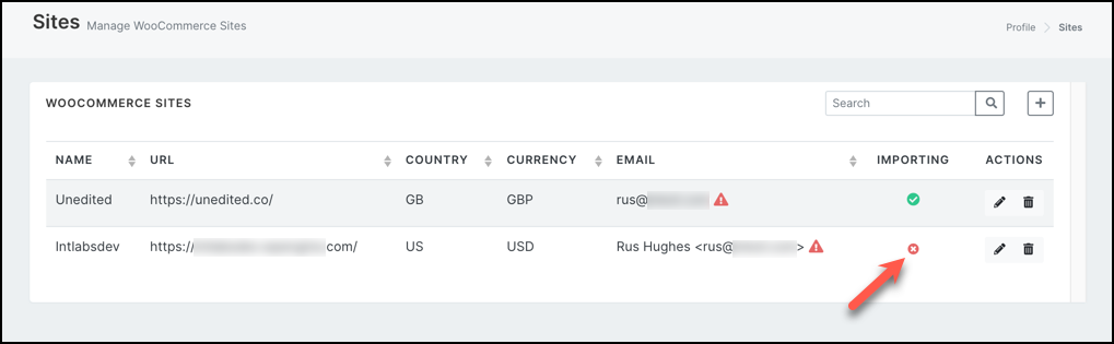 3) A red cross in the importing column in Sites List